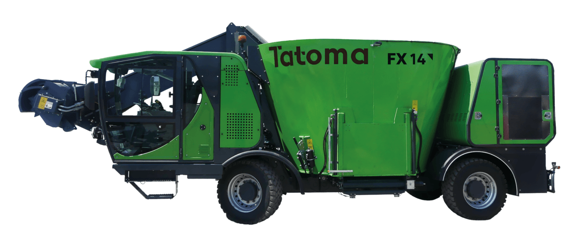 Mélangeuse automotrice de 14 m3 à vis verticale. Conception compacte permettant une bonne maniabilité. Grande cabine offrant une visibilité sur tous les travaux de chargement et de déchargement. Suspension des essieux assurant une bonne adhérence sur tous les terrains. 2 roues motrices, 4 roues directrices, homologuée route. L'expérience de TATOMA X LINE dans le mélange permet d'obtenir une ration homogène et aérée pour ingestion optimale par les animaux.