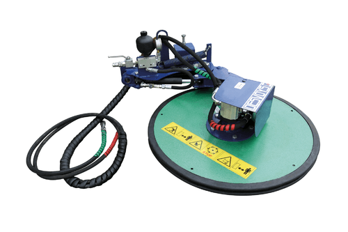 Broyage à droite : attelage 3 points arrière, 3 points avant ou chargeur. Broyage à gauche : attelage 3 points avant et télescopique. Rotor avec 3 couteaux escamotables. Couteaux 3 positions. Vitesse de rotation du rotor 1 900 tr/mn à 50 L/mn. Coupelle d'appui Ø 700 mm libre en rotation avec semelle HARDOX et inclinaison pour un meilleur suivi du sol. Effacement par vérin et boule d'azote réglable par pompe à main. Largeur de travail : 1 m. Fabriqué en France