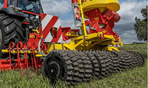 3 - Régénérateur de prairie combiné GK pour l’entretien des prairies, le sursemis et le nouveau semis d’herbes que ce soit sur terrain plats ou escarpés. Combinaison de dents de 12 mm ou 10 mm d’épaisseur et d’un rouleau suiveur.