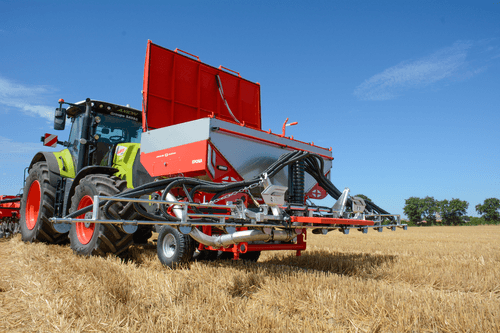 Trémie inox, cloisonnée et pressurisée 1 700 ou 2 300 L, grande ouverture pour faciliter le remplissage, doseur inox en simple ou double distribution, grande plage de débit grâce aux différentes bobines, entraînement hydraulique de la turbine, marche pied, disponible en version Isobus pour compatibilité coupure de tronçons et modulation de dose. Nombreuses options possibles (tasse-avant auto-directionnel, rampe frontale, tête de répartition, kit de distribution…).