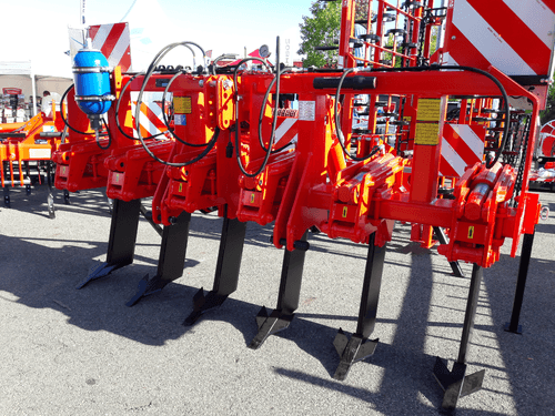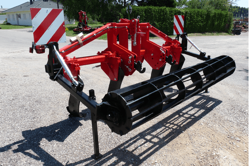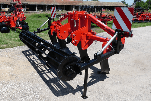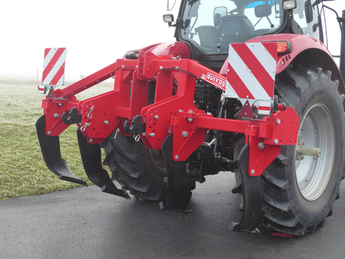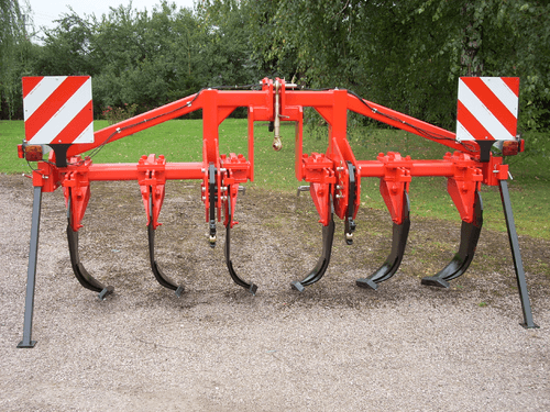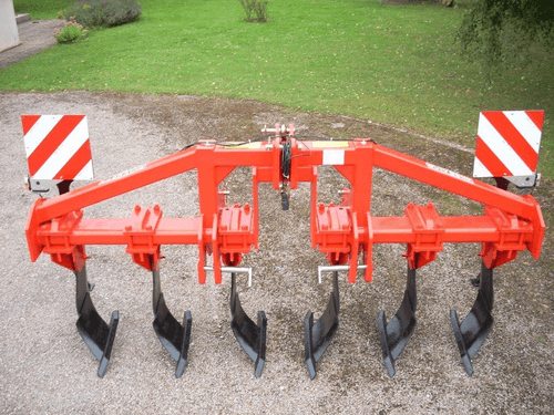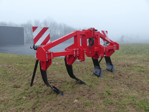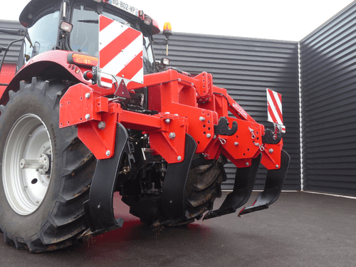 Disponible de 3 à 7 dents, épaisseur 30 mm, soc sabot en acier traité, dégagement sous châssis 750 mm. Sécurité par boulon de cisaillement. 2 roues de terrage pneumatiques, réglage par vis.