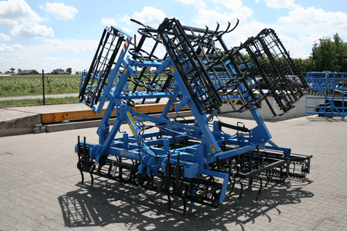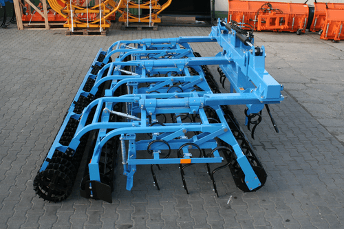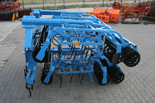 Attelage 3 points cat. II et III sur axes. 4 rangées de dents de cultivateur SU 32x12 renforcées avec soc standard. Double rouleau en fers plats dentés Ø 300mm.