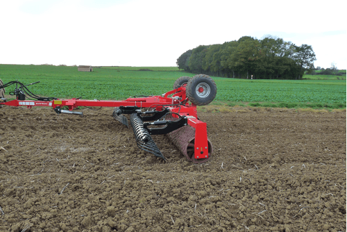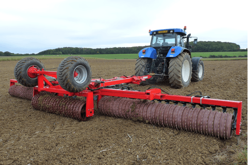 Repliage et dépliage des sections hydrauliques synchronisées. Béquille escamotable et freinage hydraulique. Attelage sur bras de relevage Cat.3