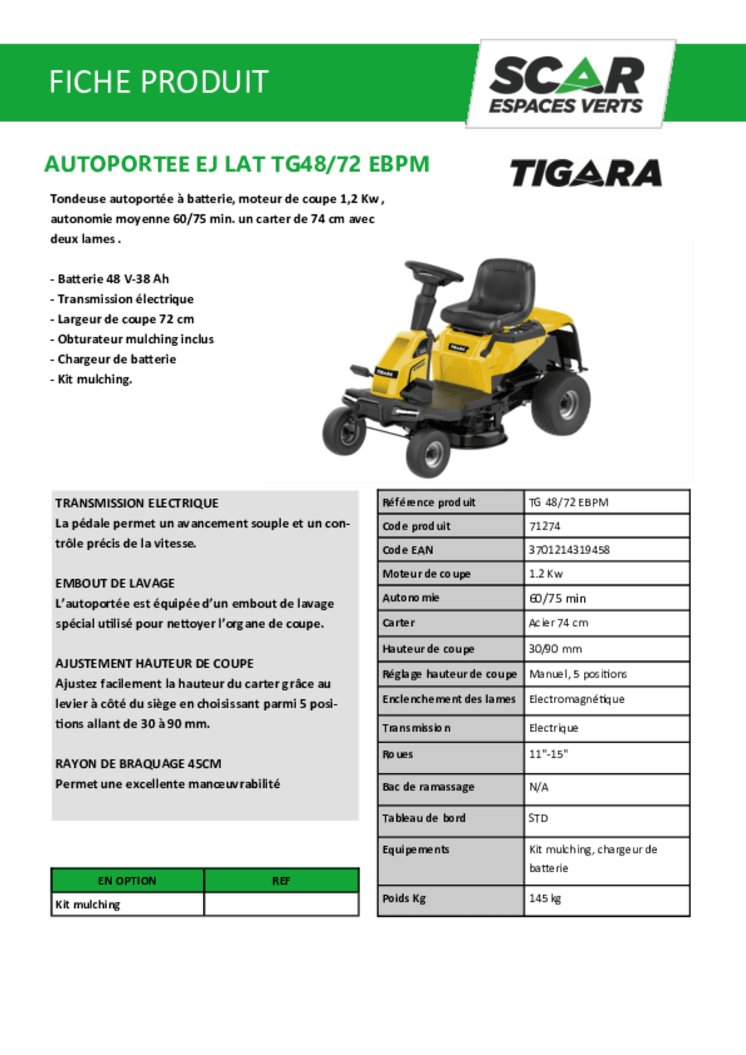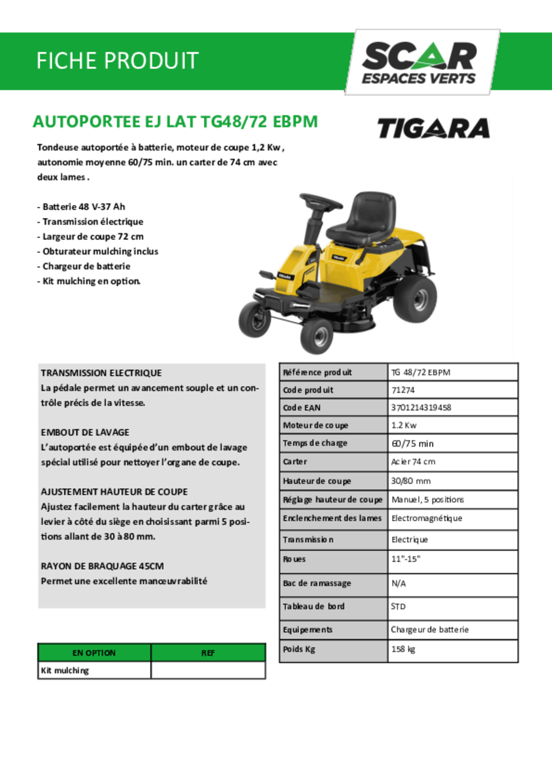 Tondeuse autoportée à batterie RIDER TG 48/72 EBPM