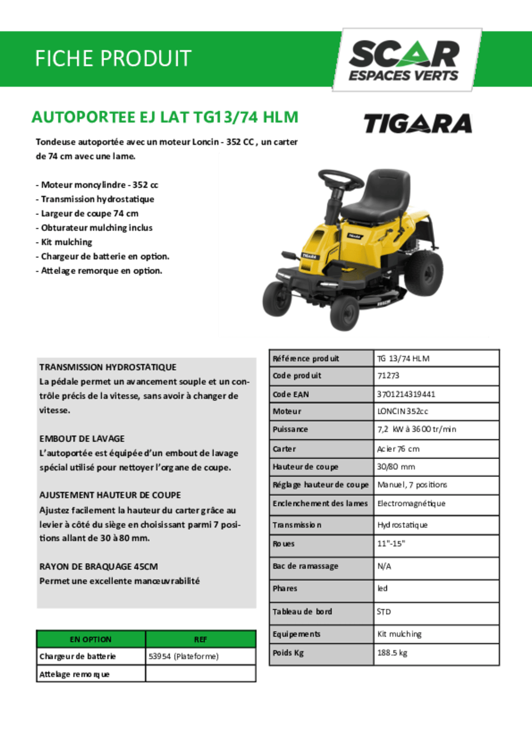 | Largeur de coupe | 74 cm |