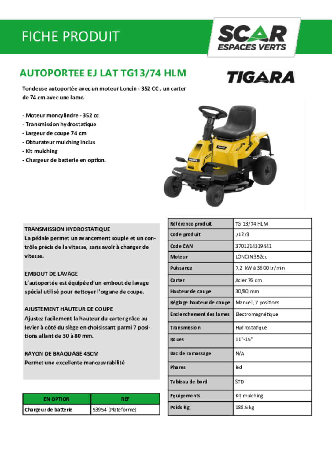 Chargeur de batterie et attelage en option.