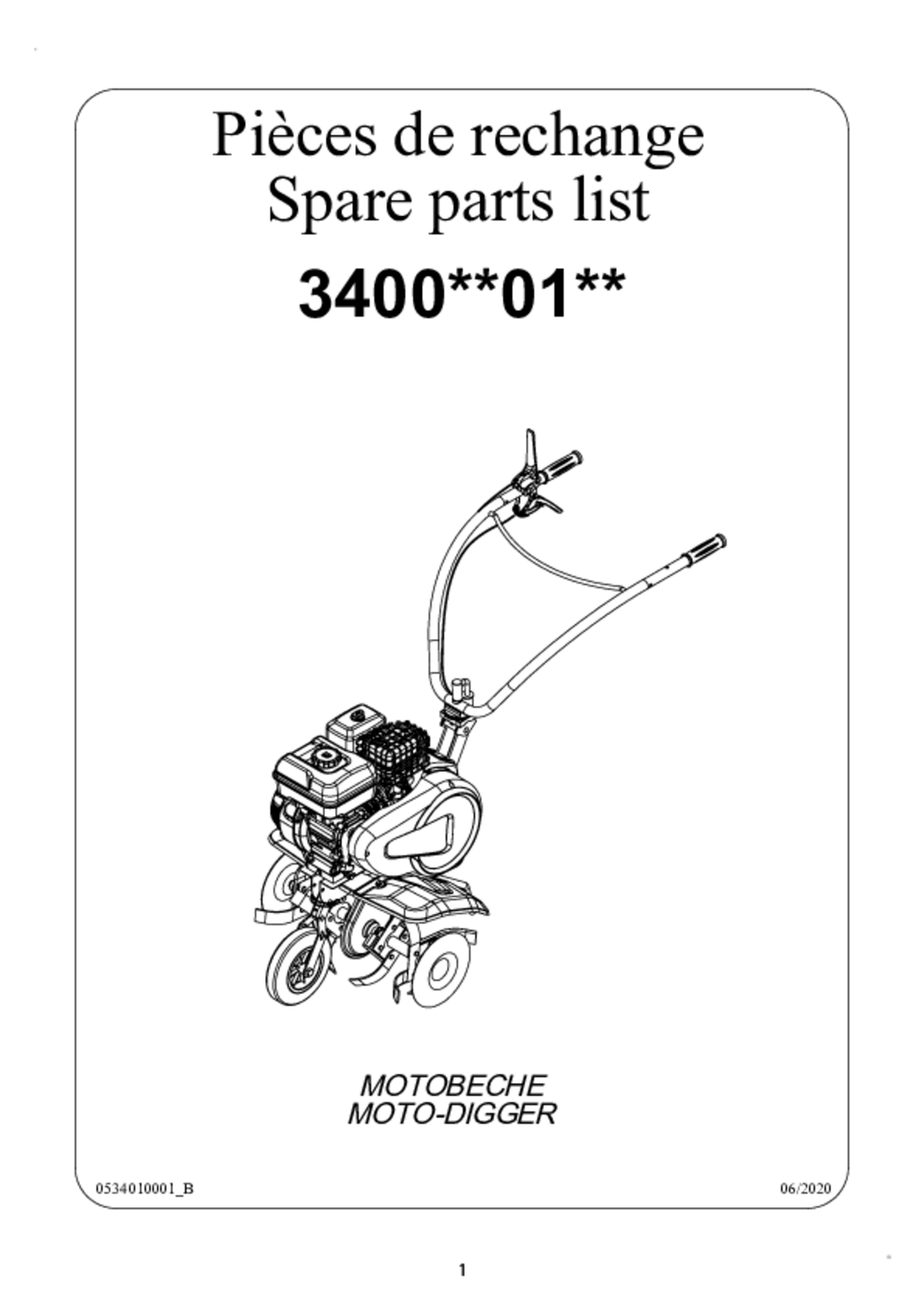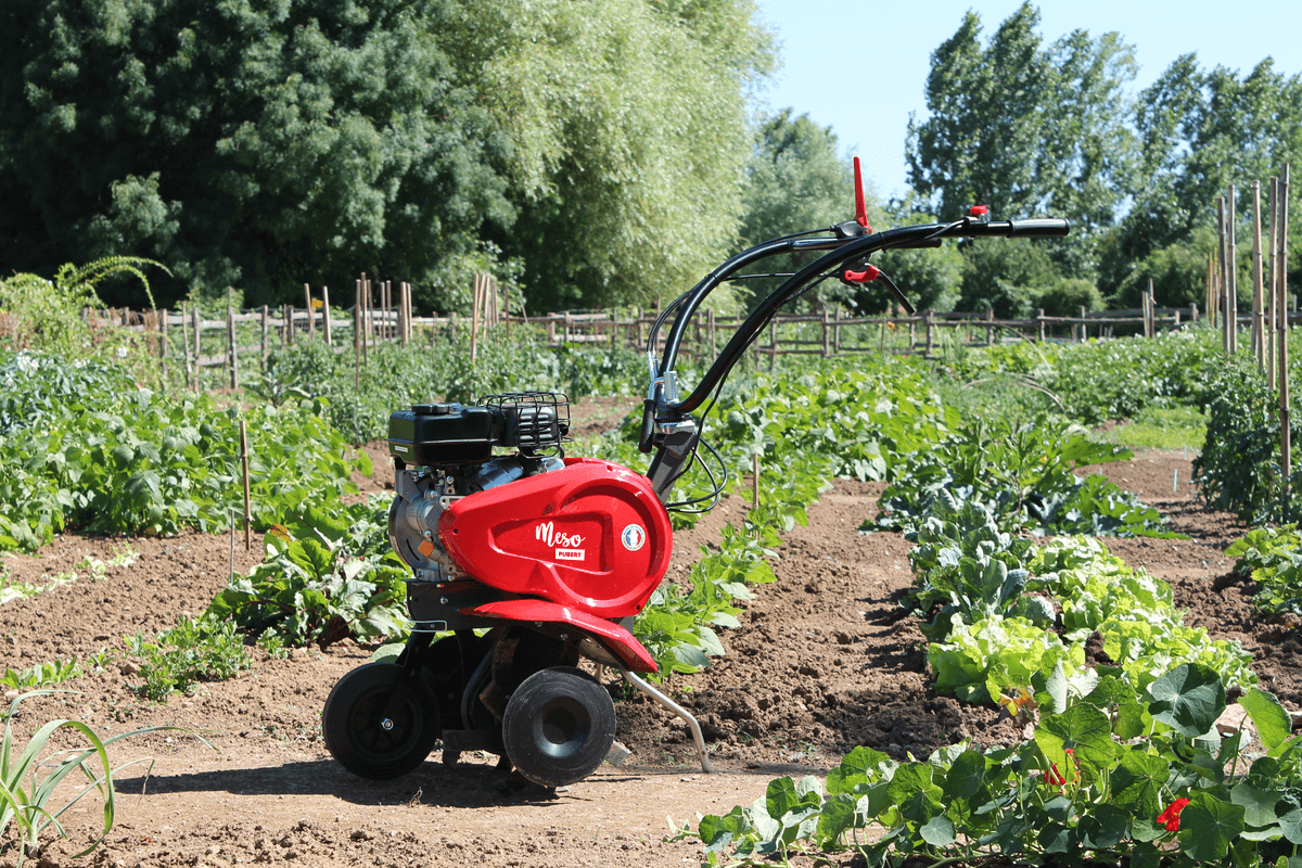 Moteur PUBERT R80. 79 cc. 1 vitesse AV et 1 AR. 4 fraises Ø 285 mm. Roue AV escamotable. Béquille de terrage.