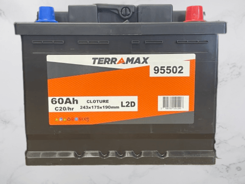 Batterie de clôture. Décharge lente. Tension : 12 V. Capacité : 60 Ah. Dimensions : 242x175x190 mm. Bornes : longueur. Polarité + : à droite.