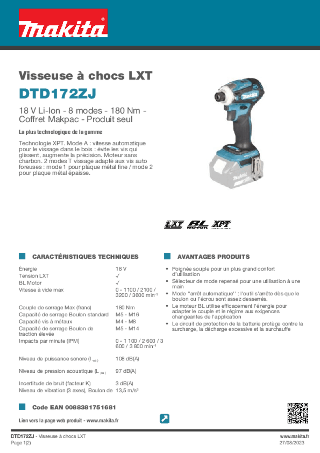 Capacité : boulon standard : 5 à 16 mm, boulon HR : 5 à 14 mm., vis à métaux : 4 à 8.