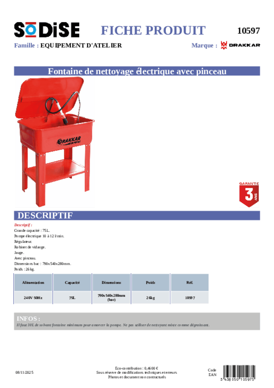 Grande capacité : 75 l. Pompe électrique 10 à 12 L/mm - 240 V - 50Hz Régulateur, robinet de vidange, jauge. Dim. du bac : 790 x 540 x 280 mm.