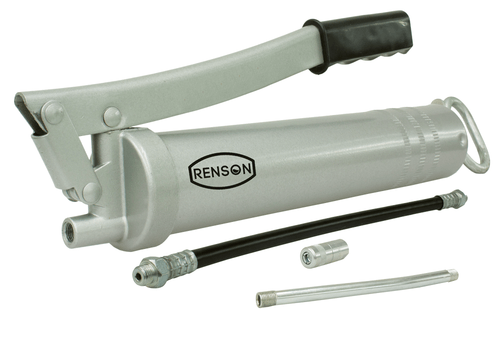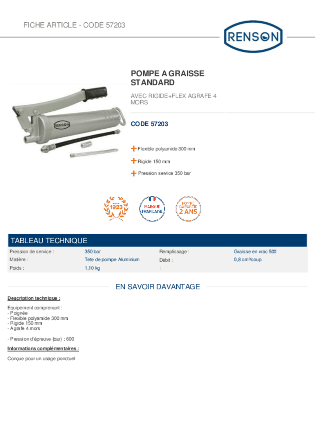 Flexible en polyamide, long. 300 mm, agrafe 4 mors. Tête de pompe en aluminium. Débit : 0,8 cm³/coup. Pression de service 350 Bar, haute pression jusquà 600 Bar. Pour cartouche 400 g et graisse en vrac.