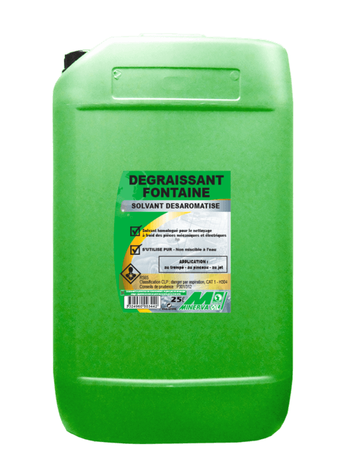Dégraissant fontaine. Liquide clair homologué. Non miscible dans l'eau. Dégraissant et anti rouille. Pour le nettoyage à froid des pièces mécaniques et électriques. Séchage rapide des pièces nettoyées. Sans étiquetage. Neutre et sans odeur. S'utilise pur, au trempé, au pinceau ou au jet pour toutes pièces précises ou délicates craignant l'oxydation et l'humidité. Bidon 25 L.