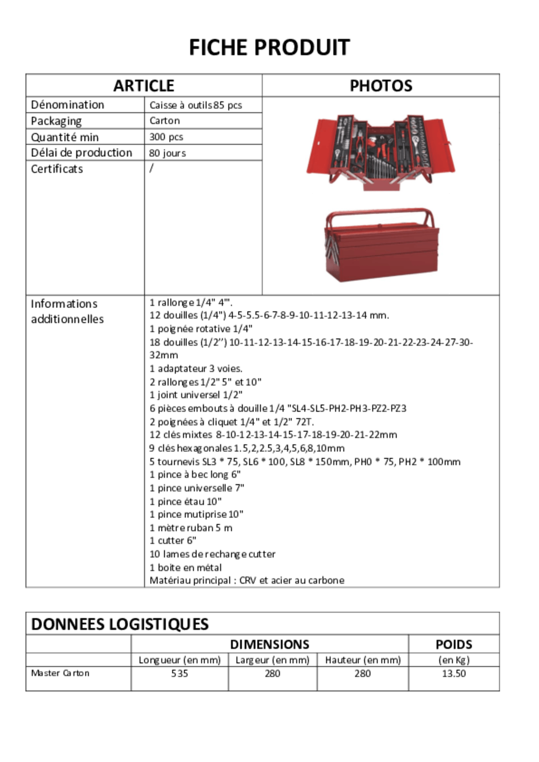 Caisse à outils 85 pièces