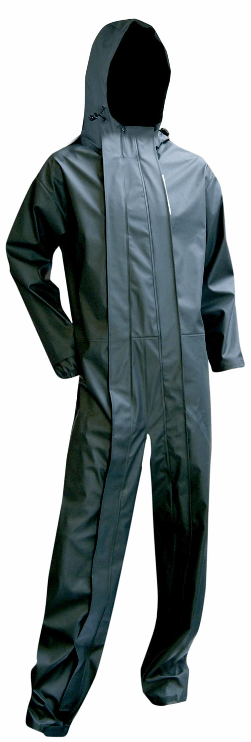 Kaki. 100 % polyester, 360 g/m2, enduction : polyuréthane, PVC. Grande capuche, 2 fermetures à glissière sous pattes, poignets coupe-vent, taille élastiquée dos. Coutures thermo soudées étanches, petit passepoil. Taille de 2 à 5.