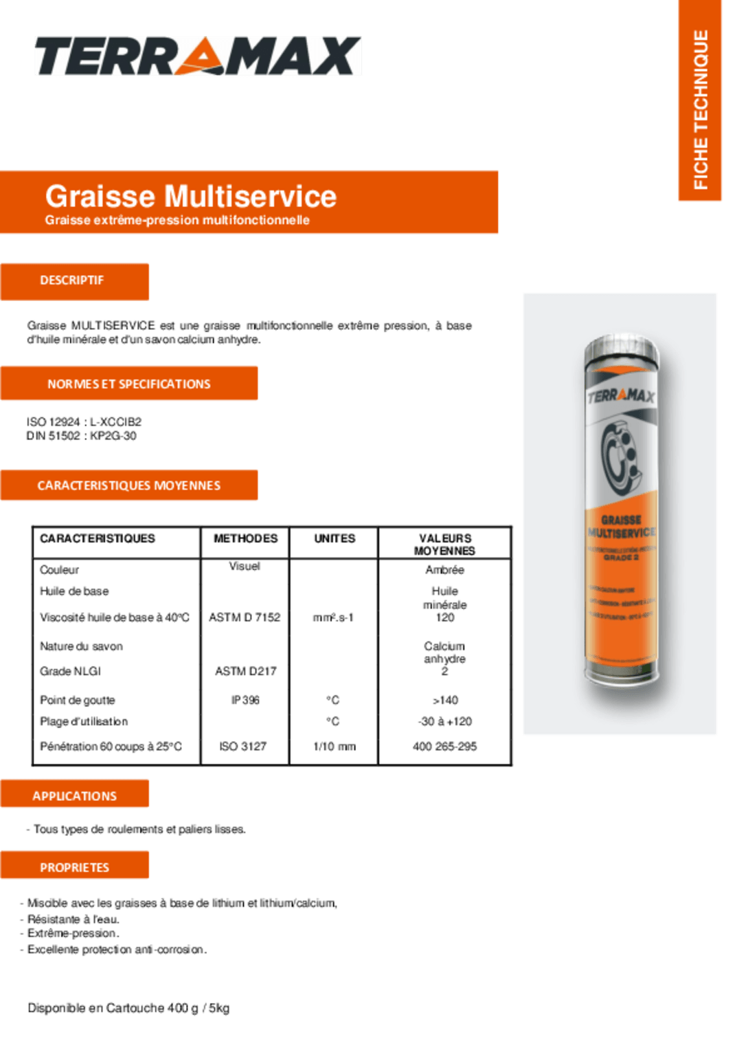 Couleur ambre. Grade NLGI : 2. Savon : calcium. Cartouche 400 g.