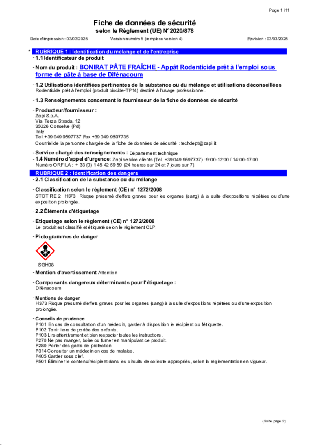 Pâte fraîche. Sachet de pâte 10 g, Difénacoum ,seau de 5 kg.